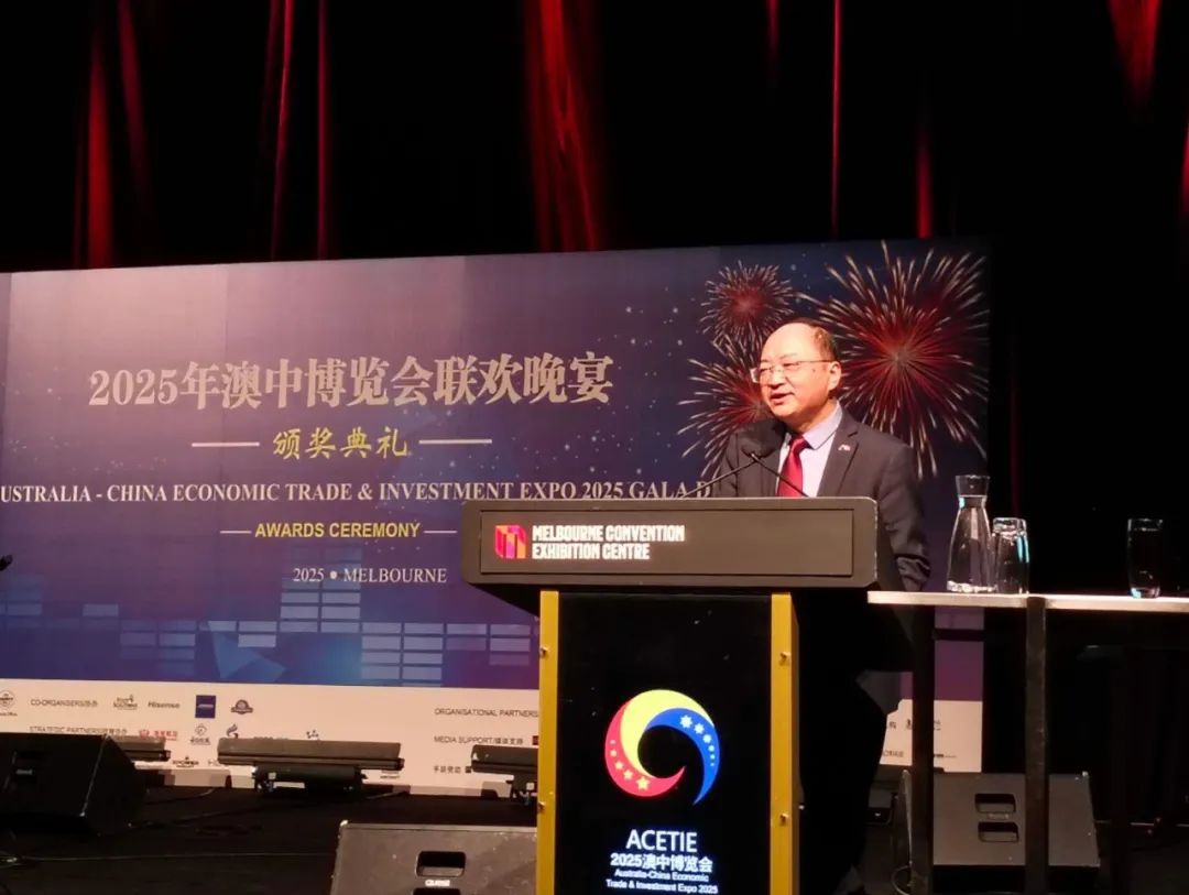 8月14日,2025澳中博览会在墨尔本展览中心开幕。房新文总领事陪同肖千大使出席开幕式及主论坛(详见驻澳使馆公众号),并在博览会晚宴中致辞。澳前贸易部长罗布、维州财政部长皮尔森、维州议员哈默、狄明贤及维州反对党领袖巴廷等政要,驻澳使馆经商处参赞王鑫、我馆负责经商事务的参赞衔领事迟洁超,以及当地企业、展商代表等400余人参加活动。